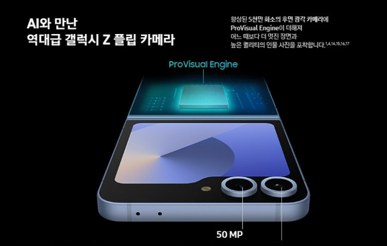 카메라 성능도 크게 향상되었는데요, 갤럭시 Z플립6는 메인 광각 카메라에 5,000만 화소 센서를 탑재했습니다. 또한 초광각 카메라는 1200만 화소를 채택하여, 저조도 환경이나 나이트 촬영에서 높은 품질의 사진을 기대할 수 있습니다.