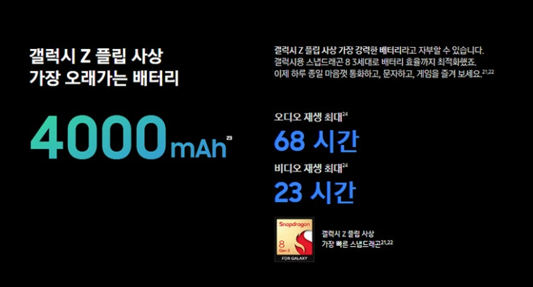 배터리 성능도 크게 개선되었습니다. 갤럭시 Z플립6는 4,000mAh 대용량 배터리를 탑재하여, 오디오 재생은 최대 68시간, 비디오 재생은 23시간을 지원합니다. 일반적인 사용 패턴에서는 하루 종일 사용할 수 있는 충분한 용량을 제공하고 있습니다.