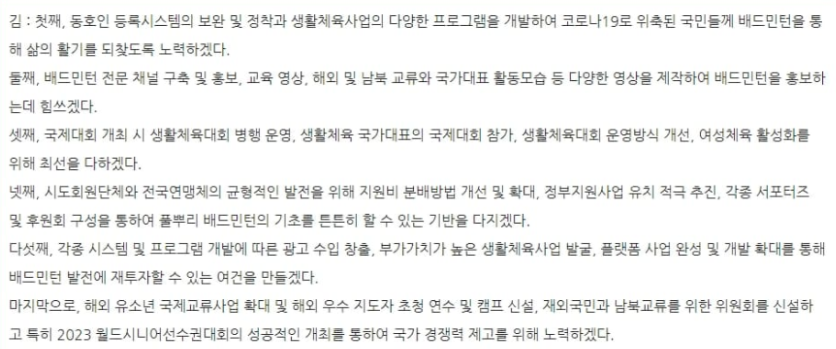 김택규 회장이 배드민턴협회장 선거에 출마할 당시 제시한 공약이 현재 상황과 크게 달라지면서 비판의 목소리가 높아지고 있는데요, 선거 당시 김 회장은 다음과 같은 공약을 내세웠습니다: 1. 배드민턴 동호인의 저변 확대와 회원 관리 체계화, 2. 투명한 국가대표 선발 및 발전적 운영 방안 강구, 3. 유소년 배드민턴 육성 정책 강화, 4. 해외 및 북한과의 경기 훈련 교류 모색. 그러나 이 공약들은 당선 이후 제대로 이행되지 않았다는 비판이 제기되고 있습니다.