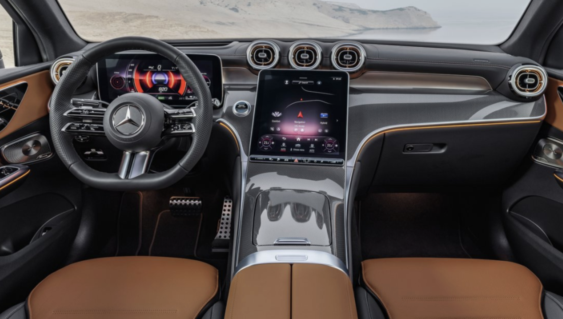 실내는 고급스러움과 실용성을 동시에 만족시키는 구성을 보여줍니다. 12.3인치 디지털 계기판과 11.9인치 중앙 디스플레이가 탑재되어 직관적인 사용성을 제공하며, 새로운 통풍구 디자인과 통합된 시트 조절 버튼은 깔끔하고 현대적인 인테리어를 완성합니다. 대시보드와 문 손잡이 디자인에는 S클래스에서 영감을 받은 고급스러움이 적용되었고, 트렁크 용량은 기본 545리터에서 최대 1490리터까지 확장 가능하여 실용성도 뛰어납니다.